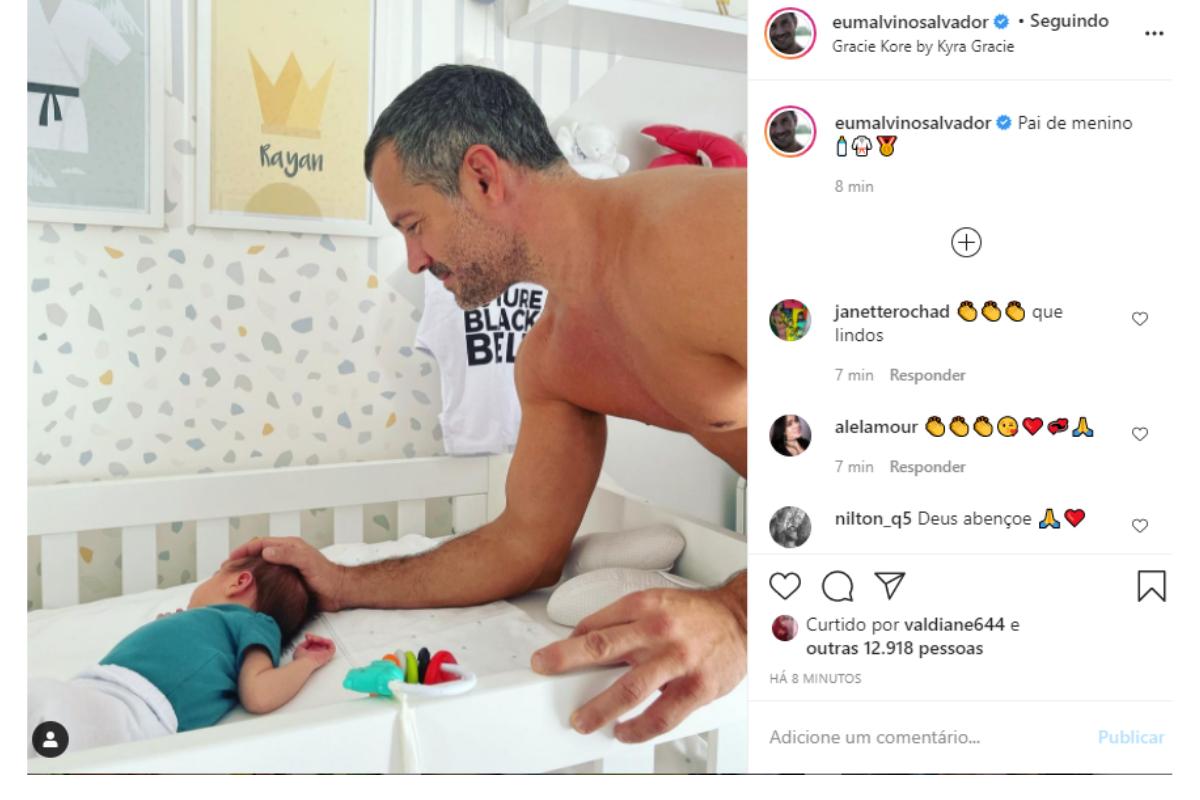 O ator Malvino Salvador usou as redes sociais nesta terça-feira, 19 de janeiro, para publicar uma foto cheia de amor ao lado do filho, Rayan, fruto do relacionamento com a atleta Kyra Gracie. Na imagem, o pai aparece acariciando o filho, que está deitado no berço. “Pai de menino”, escreveu o famoso ao compartilhar a foto.
