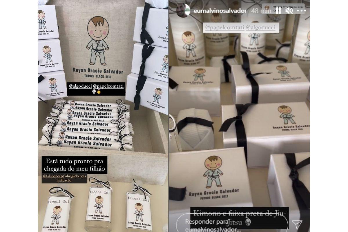 Inspirado no tema de Jiu Jitsu, Malvino mostrou os detalhes: “Está tudo pronto para a chegado do meu filhão. Kimone e faixa preta de Jiu Jitsu”, escreveu o ator na publicação dos stories.