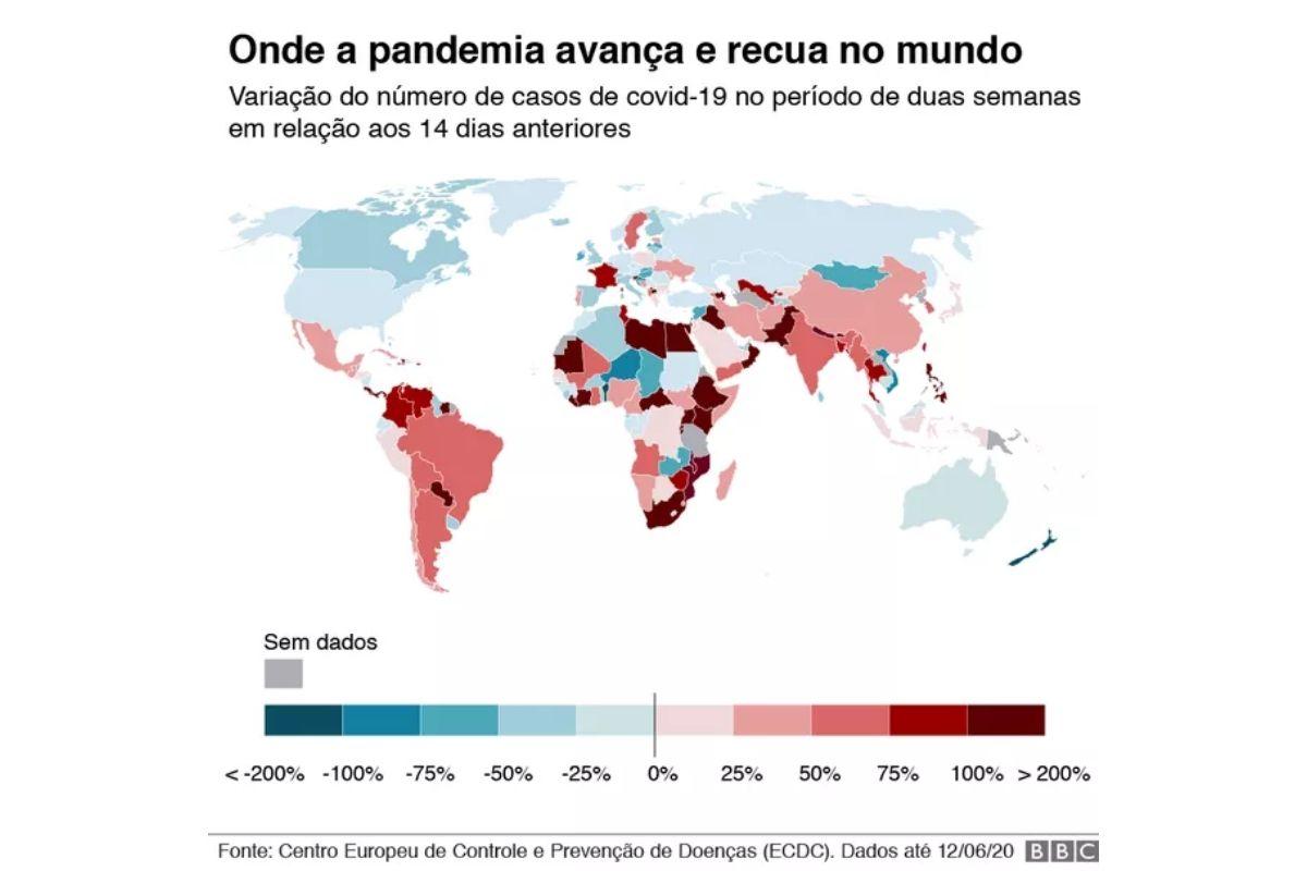 De acordo com informações publicadas pela BBC, atualmente é possível dividir os locais afetados em três fases: número de infectados em alta, pandemia estabilizada e casos novos em queda. O Brasil tem o maior número de novos casos por dia, mas quando se mede o total a cada 1 milhão de habitantes está em nono (150 casos por milhão), segundo dados do Centro Europeu de Controle e Prevenção de Doenças (ECDC).