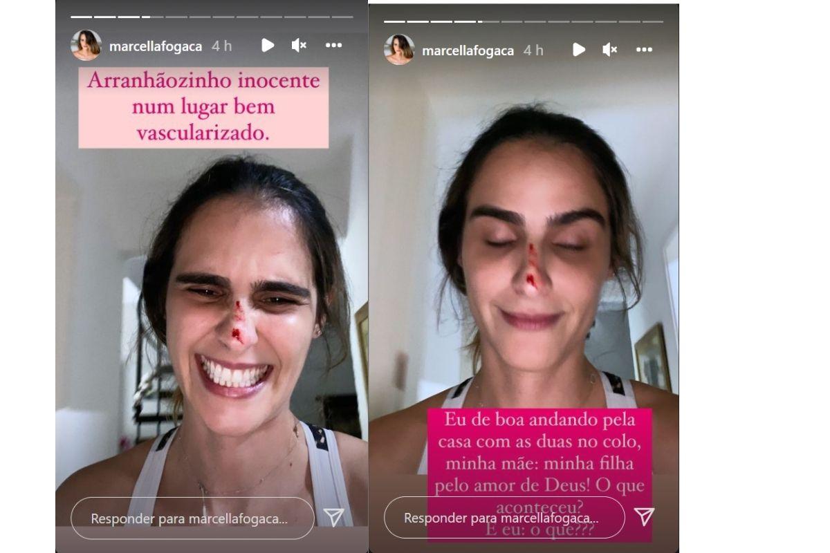 Perrengue! Marcella Fogaça sempre usa as redes sociais para compartilhar a rotina de cuidado com as filhas gêmeas. Nesta quinta-feira, 30 de dezembro, ela publicou duas fotos em seus stories para mostrar o arranhão que recebeu sem querer no nariz.