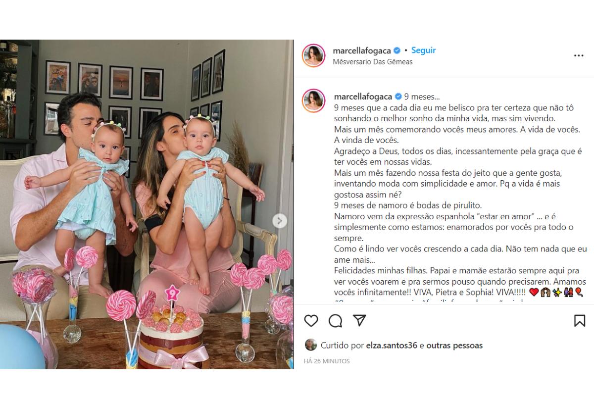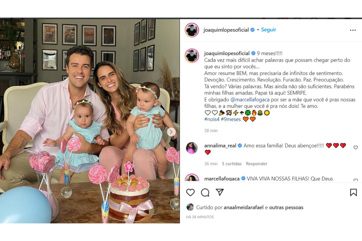Foi por meio do Instagram que os pais de primeira viagem compartilharam mensagens desejando parabéns para as meninas. Nas fotos publicadas, tanto Marcella Fogaça quanto Joaquim Lopes aparecem juntos segurando Sophia e Pietra no colo durante a celebração organizada por eles.