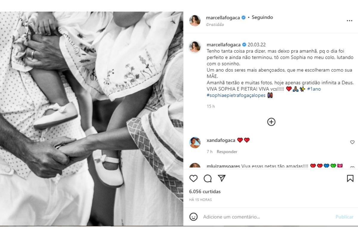 “20.03.22 Tenho tanta coisa pra dizer, mas deixo pra amanhã, pq o dia foi perfeito e ainda não terminou, tô com Sophia no meu colo, lutando com o soninho. Um ano dos seres mais abençoados, que me escolheram como sua MÃE. Amanhã textão e muitas fotos, hoje apenas gratidão infinita a Deus. VIVA SOPHIA E PIETRA! VIVA vcs!!!!!”, escreveu ela, ao compartilhar a imagem. Até p momento, Marcella ainda não compartilhou mais detalhes da comemoração.