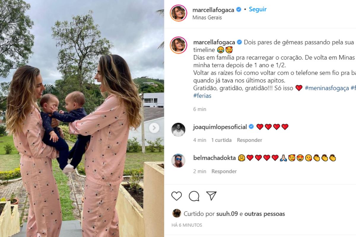 “Dois pares de gêmeas passando pela sua timeline”, brincou na legenda. Em seguida, Marcella conta sobre a viajem que fez para Minas Gerais, onde passou a infância. “Dias em família pra recarregar o coração. De volta em Minas Gerais, minha terra depois de 1 ano e 1/2.”