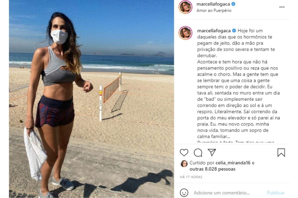 Marcella Fogaça usou as redes sociais na noite da última quarta-feira, 14 de julho, para falar um pouco sobre o puerpério e as mudanças no corpo após dar à luz as gêmeas Sophia e Pietra, frutos do relacionamento com o ator Joaquim Lopes. Para falar sobre o assunto, ela compartilhou uma foto em que aparece na praia, após fazer exercício físico.