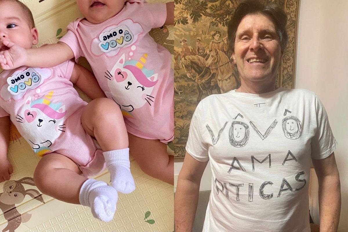 Na imagem, Pietra e Sophia aparecem usando um body em que é possível ler “amo o vovô”. Em seguida, Marcella compartilhou uma foto do avô usando uma camiseta branca em que estava escrito “vovô ama piticas”, feito à mão com caneta preta de tecido. Na legenda, ela explicou o que aconteceu.