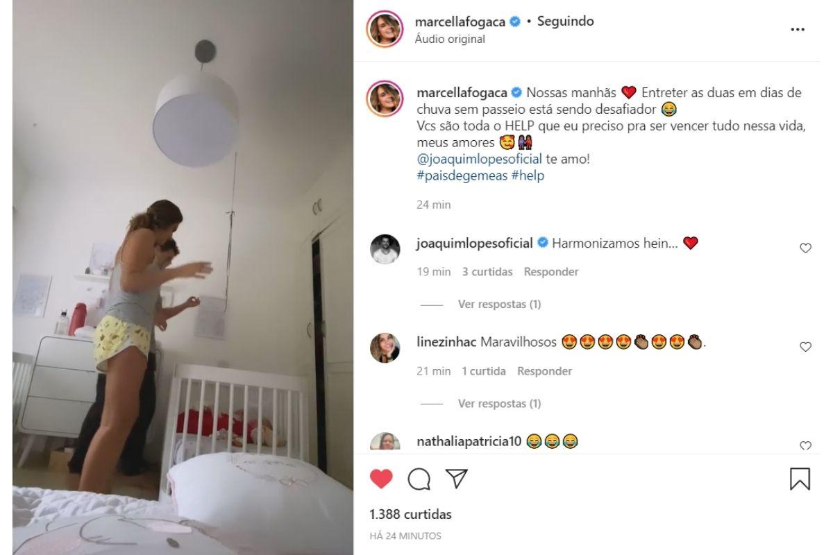 A cantora e compositora, Marcella Fogaça, mãe das gêmeas Sophia e Pietra, costuma compartilhar a rotina com a família nas redes sociais, além de textos cheios de amor. As filhas são frutos do relacionamento da artista com o ator Joaquim Lopes, que estão juntos desde 2018. E nesta última segunda (01), ela publicou um vídeo, nas redes sociais, mostrando como se diverte com as filhas em um dia chuvoso.