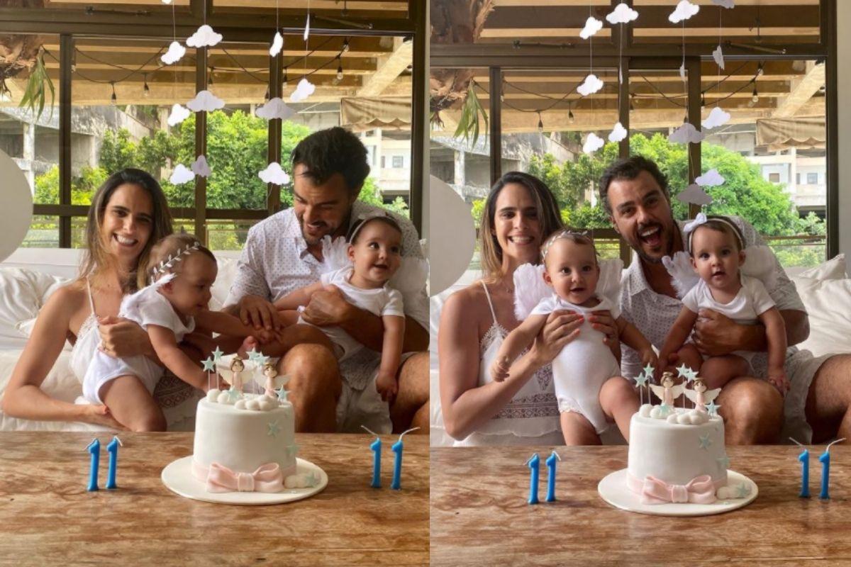 “No making off de hj: Como todo dia 20, elas desregularam a rotina. Então quando Sophia tava com fome, Pietra tava com sono. A auréola da Pietra arrebentou. Substituímos por um lacinho angelical. Mamãe não conseguiu secar o cabelo pra variar e na foto não aparece toda decoração suada, pra variar. Mas na hora do parabéns, todo mundo se esqueceu de tudo, bateu palmas, se divertiu e amou. É isso. Família. Sincronizar e comemorar as alegrias, se apoiar nos perrengues. Hehe. Amo vcs demaaaais”, concluiu.