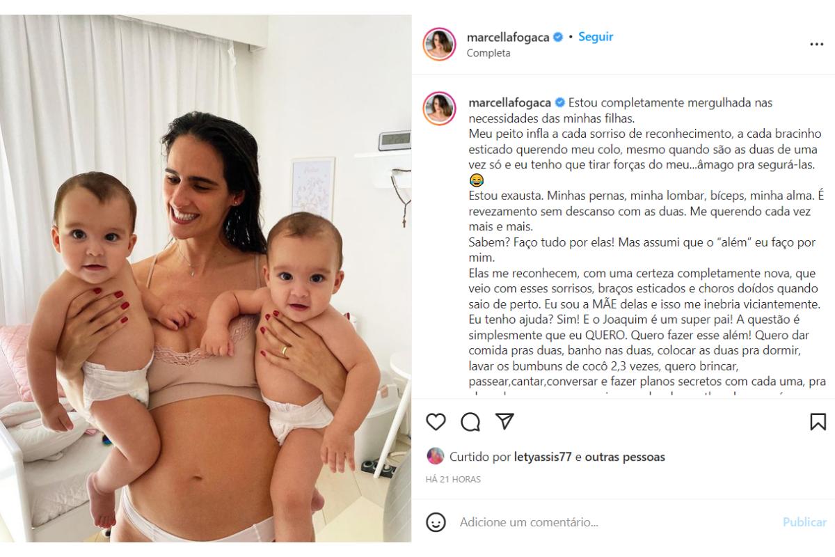 “Então sim! Eu continuo querendo ajuda e que insistam pra aliviar minha carga. Por favor não parem! É só que tá passando tão rápido! E eu não vou perder meu tempo tentando não ficar exausta, forçando um descanso que as vezes mais me estressa do que quando eu decido simplesmente ceder ao fluxo intenso, às demandas de dois bebês de 9 meses que descobriram como expressar seu amor por mim das formas mais puras e lindas que eu já vi. Exausta sim, mas realizada, da minha maneira.”, finalizou Marcella Fogaça.