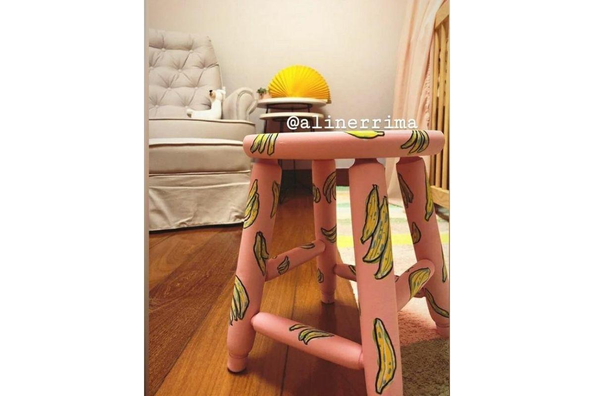 Ela está no 9º mês da gestação e compartilhou algumas fotos mostrando uma parede rosa e outra toda com bolinhas coloridas, um berço de madeira, tapete colorido e detalhes do cômodo, como itens pendurados nas paredes e um banquinho todo com desenhos de bananas.