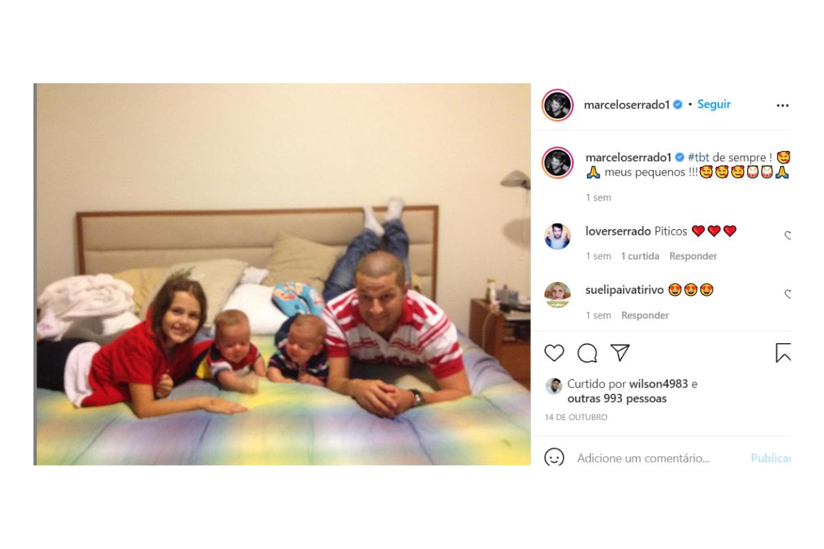 Pai da primogênita, Catarina, de 16 anos, e dos gêmeos Felipe e Guilherme, de 9 anos, o artista revelou que exige e aplica um horário rígido para que os filhos possam utilizar os aparelhos tecnológicos, para que eles não fiquem aprisionados dentro das telas. “A tela é uma coisa que nos ajuda muito, mas nos aprisiona. Meus filhos têm horário que a gente estipula para ficar na tela. É um horário rígido, ‘deste horário até esse horário você pode ver tela, depois não pode’.”, contou ele em entrevista. Para ver esta foto na íntegra, clique aqui.