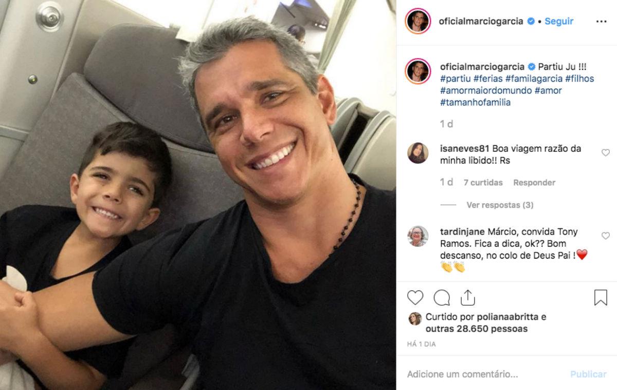 Antes de decolar, Márcio publicou uma foto no Instagram, onde tem mais de 2 milhões de seguidores, com o filho caçula João. “Partiu, Ju! #férias #famíliagarcia”, escreveu o artista na legenda. A imagem ganhou mais de 28 mil curtidas na rede social.