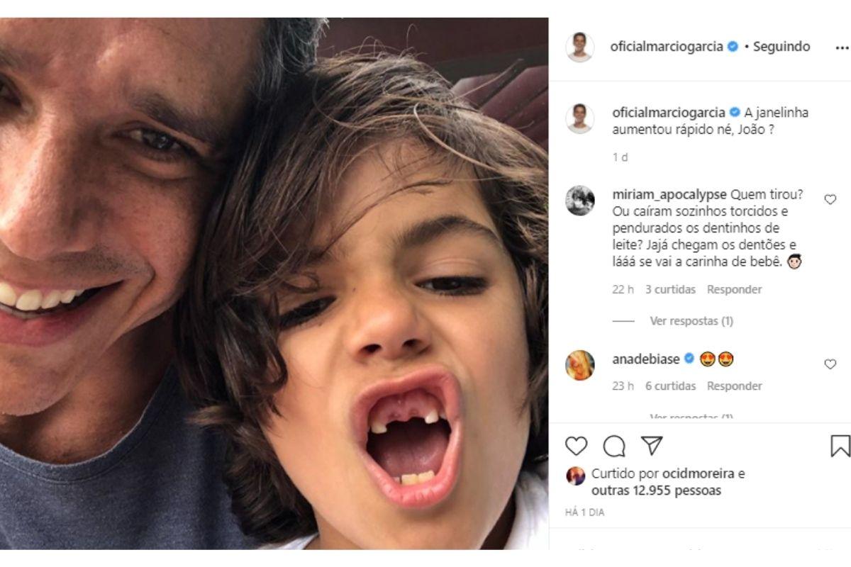 O ator e apresentador Márcio Garcia usou as redes sociais para compartilhar um momento super divertido e carinhoso ao lado do filho, João, de 5 anos. Na foto, compartilhada nesta terça-feira, 15 de setembro, o garoto aparece mostrando o sorriso banguela, após perder os dois dentes da frente. “A janelinha aumentou rápido né, João?”, brincou ele ao compartilhar a foto.