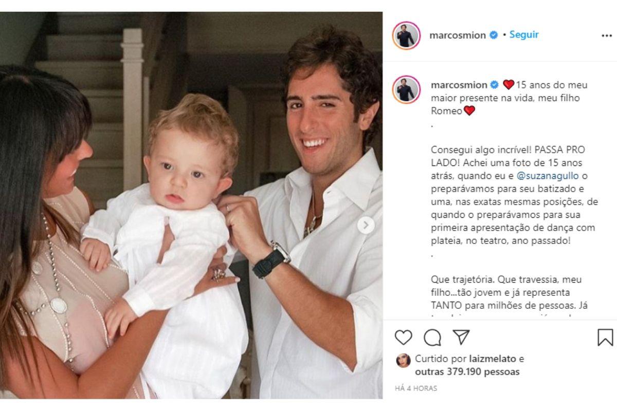 Marcos Mion usou as redes sociais para fazer uma grande homenagem ao filho Romeo, que completa 15 anos hoje. Junto ao texto, no qual contou a importância do filho, o apresentador compartilhou duas imagens ao lado de Romeu e da esposa, Suzana Gullo.