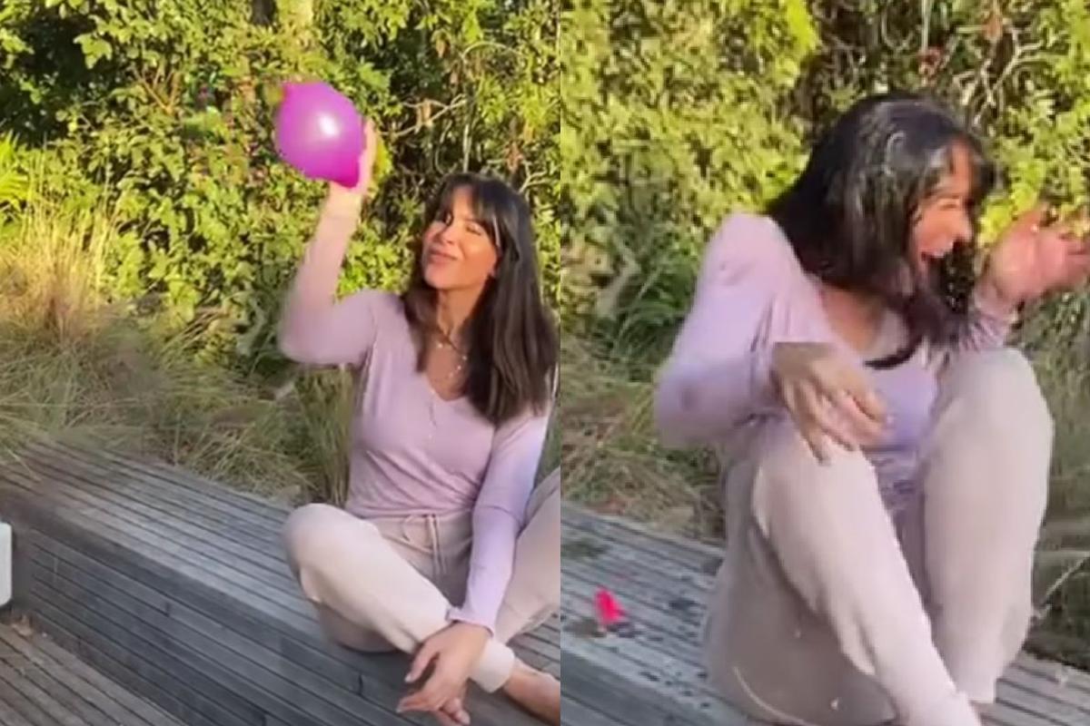 Mas Marcos quis fazer algo diferente na vez de Suzana. Ela pensou que estouraria bexigas como as crianças, mas o que ela não sabia é que uma delas estava cheia de água!