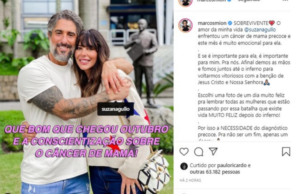 Marcos Mion aproveitou o início do Outubro Rosa e fez um post no Instagram na noite desta última-sexta-feira, 1 de outubro, para homenagear a mulher, Suzana Gullo, que enfrentou um câncer de mama. Ele compartilhou uma foto ao lado da companheira e escreveu um lindo texto relembrando a luta que ela passou.