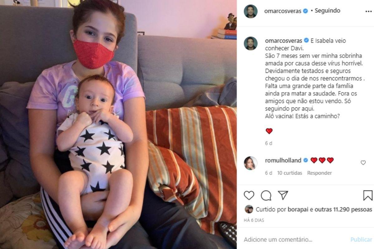 “E Isabela veio conhecer Davi. São 7 meses sem ver minha sobrinha amada por causa desse vírus horrível. Devidamente testados e seguros chegou o dia de nos reencontrarmos . Falta uma grande parte da família ainda pra matar a saudade. Fora os amigos que não estou vendo. Só seguindo por aqui. Alô vacina! Estás a caminho?”, escreveu, ao publicar a imagem.