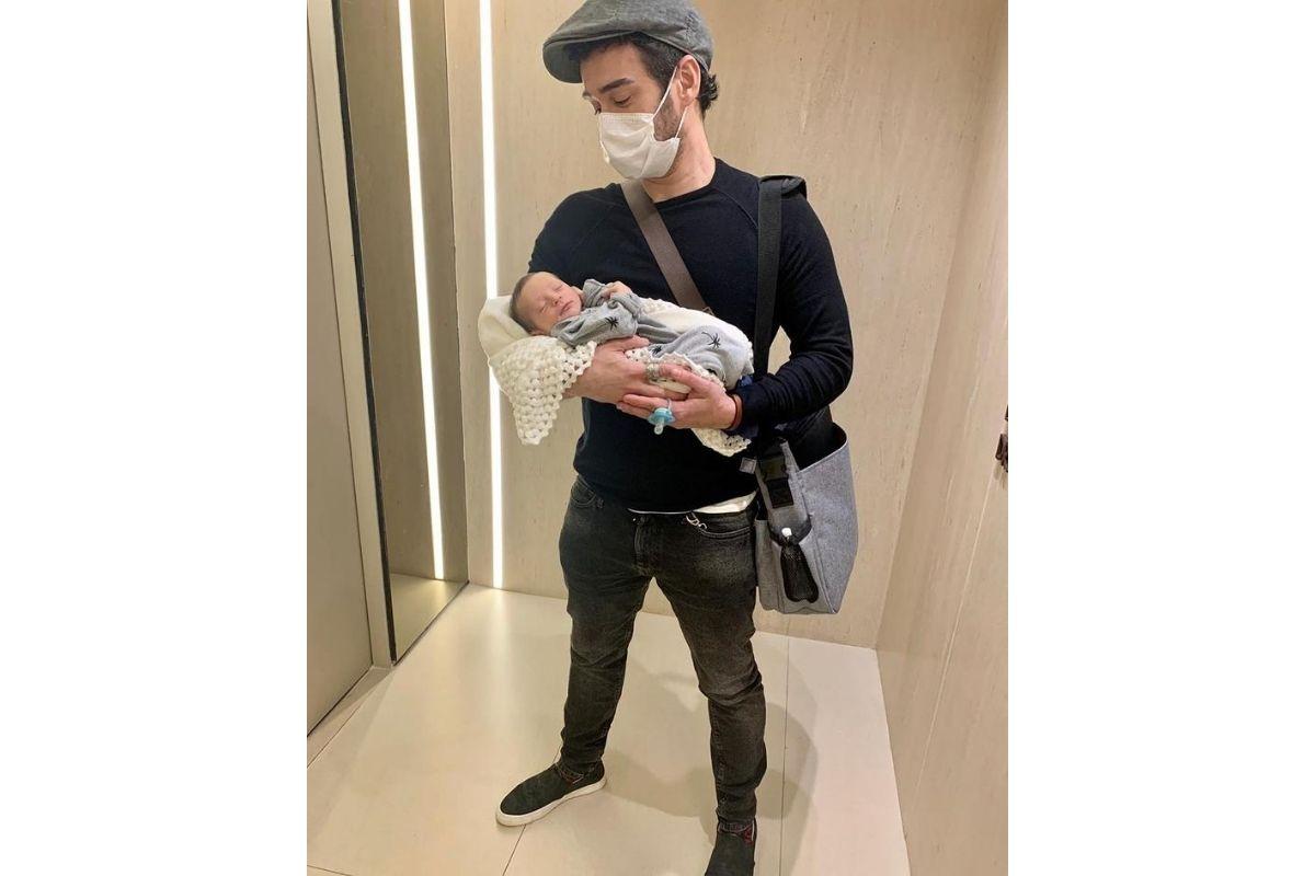 Nesta última segunda-feira, 17 de agosto, Marcos Veras levou o filho, Davi, da união com Rosanne Mulholland, para o primeiro passeio fora de casa. O menino, que nasceu no Dia dos Pais, 9 de agosto, foi fotografado dormindo no colo do ator, de macaquinho cinza e enrolado em uma manta branca.