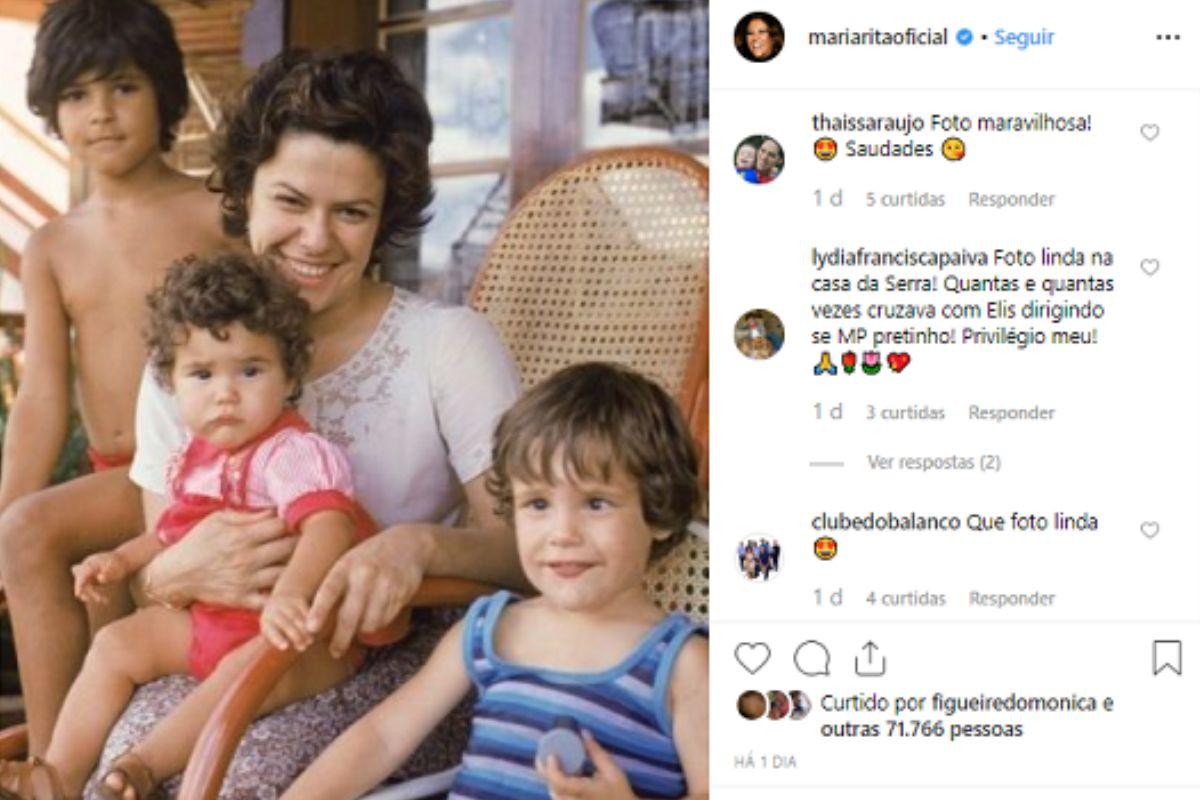 A filhada cantora, Maria Rita, publicou uma foto com a mãe de quando ainda era uma bebê. No registro postado pela filha, também cantora, em seu Instagram, os dois filhos mais velhos de Elis, João Bôscoli e Pedro Mariano, também aparecem em pé ao lado da mãe e da caçula, que está no colo.