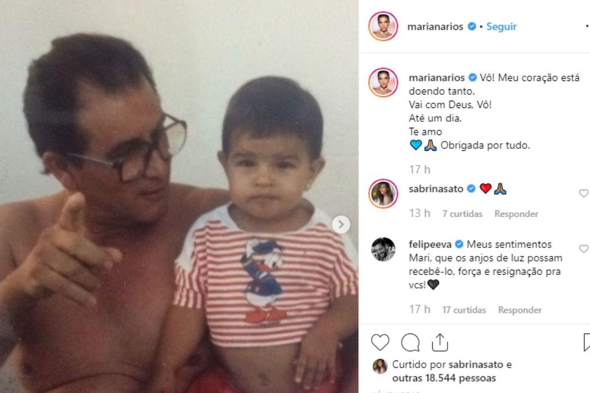 “Vô! Meu coração está doendo tanto.Vai com Deus, Vô! Até um dia. Te amo! Obrigada por tudo”, abriu o coração. Na legenda, ela recebeu o apoio de várias pessoas. “Meus sentimentos Mari, que os anjos de luz possam recebê-lo, força e resignação pra vocês!”, comentou um amigo. “Fique bem amiga, seu vô cumpriu sua missão, vai cuidar de você lá de cima”, disse Antonia Fontenelle.
