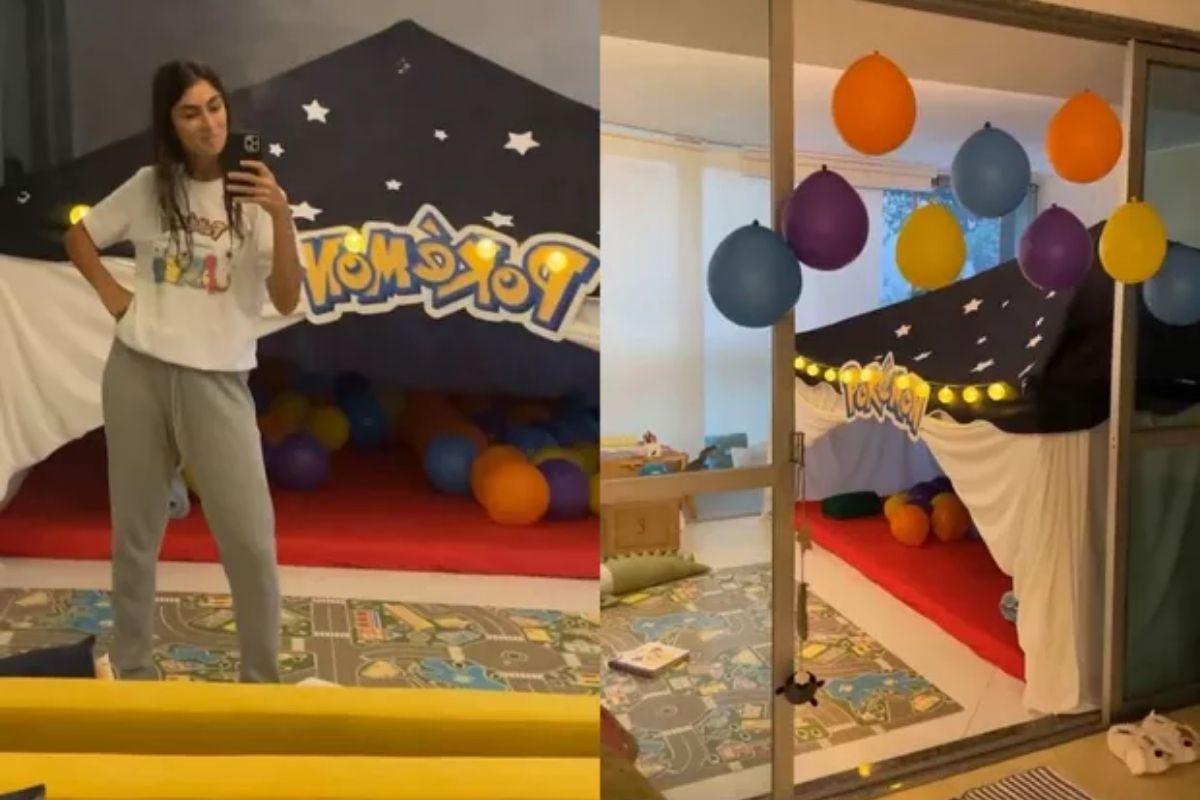 Para a decoração, foi montada uma “cabaninha” com luzes para a decoração externa e balões para a interna. O  espaço decorado para as crianças aparece confortável e cheio de almofadas. Mariana ainda disse que atedeu os pedidos do filho e a festa vai contar com um espaço para desenhar e pintar.