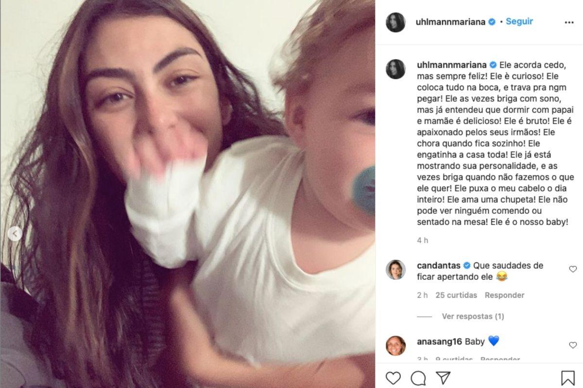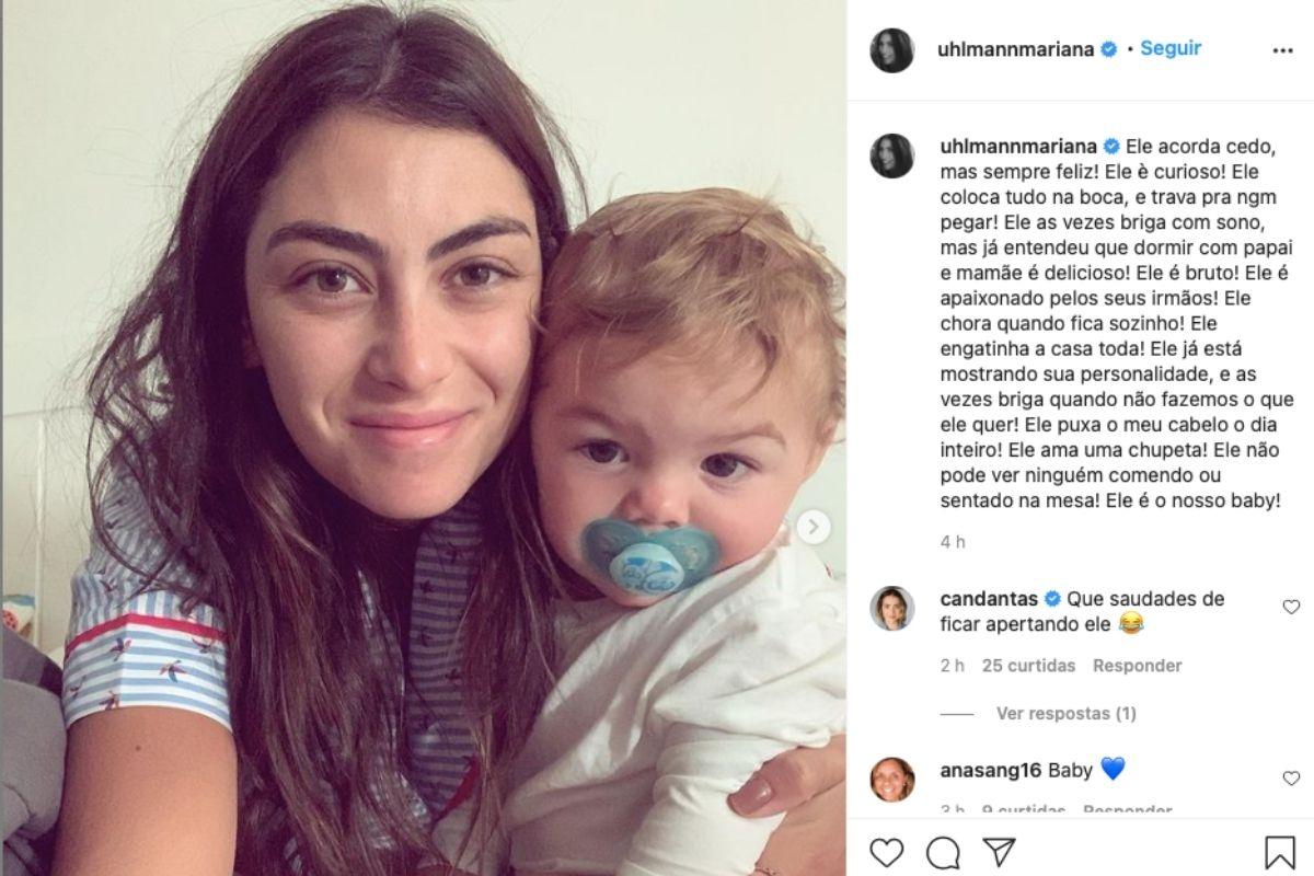Neste domingo, 29 de novembro, Mariana Uhlmann compartilhou duas fotos ao lado do caçula, Vicente, fruto do relacionamento dela com Felipe Simas. Além do mais novo ela também é mãe de mais dois filhos, Joaquim e Maria. Na primeira imagem tanto ela quando o bebê olham para câmera, na segunda, o que parece ser uma questão de segundos da primeira, Vinicius aparece tentando fugir.