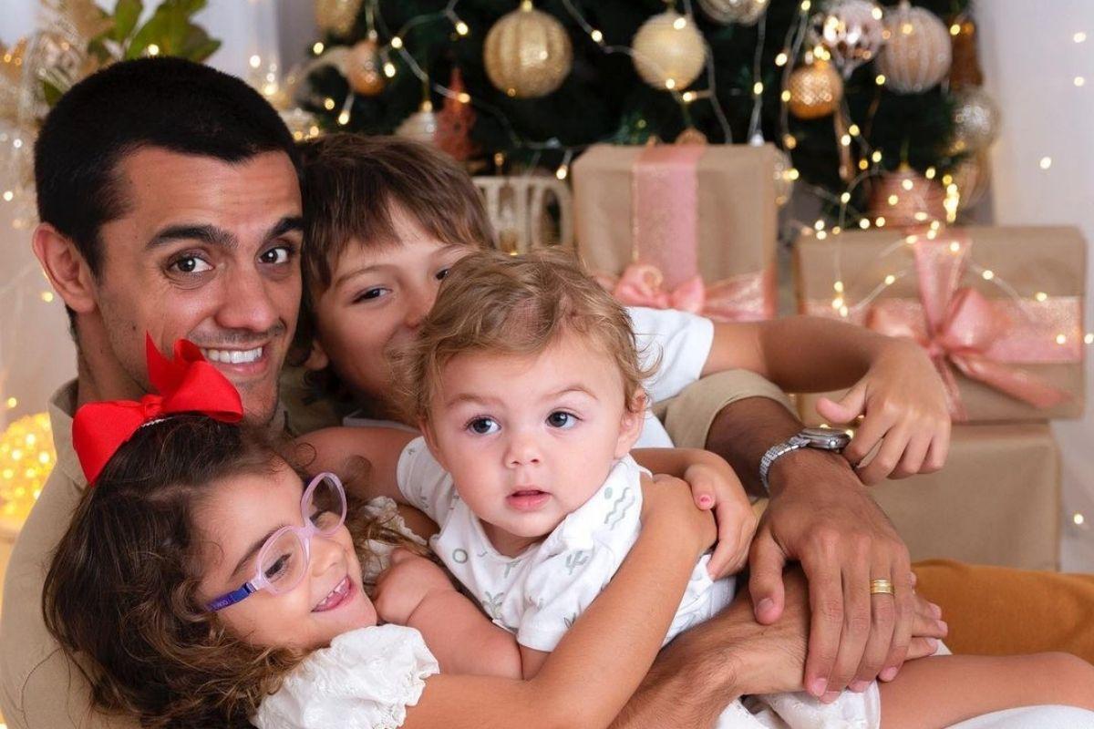 Mariana publicou um vídeo do casal com os filhos Joaquim, Maria e Vicente. Nas imagens a família canta parabéns para o ator Os pais estimulam os pequenos a assoprar a velhinha e em um determinado momento, o caçula coloca a mão no bolo do pai, causando gargalhadas.