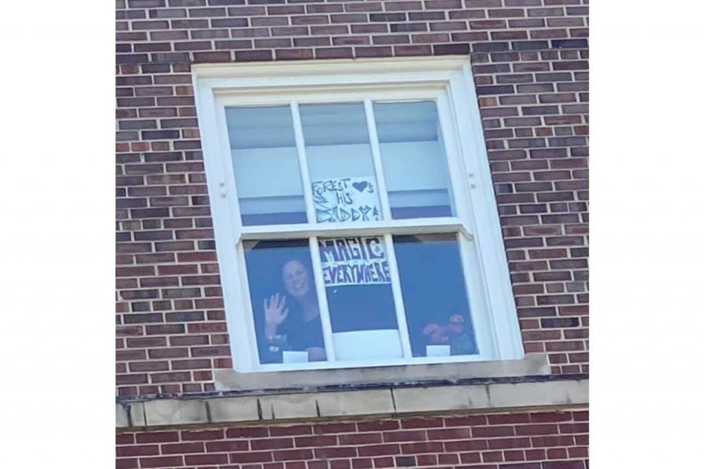 Shona, que está grávida, aparece na janela para ver os cartazes do marido (Foto: Facebook Bob Conlin)