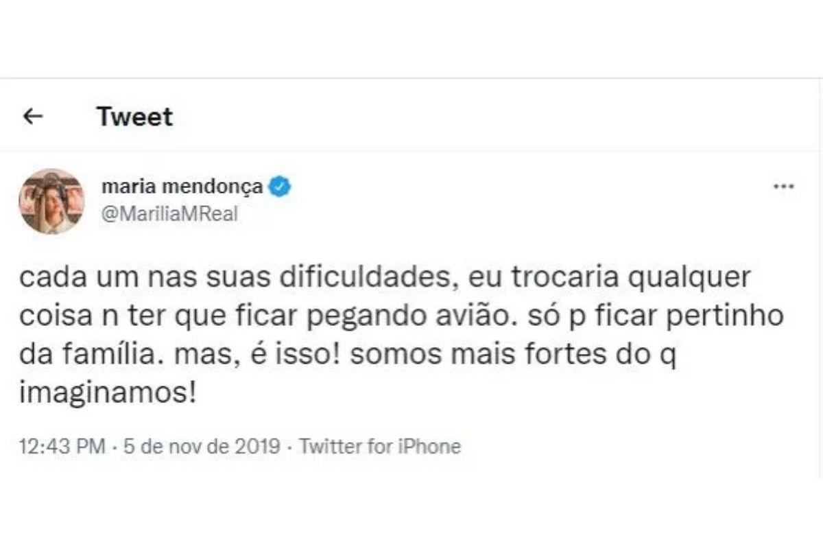 “Cada um nas suas dificuldades, eu trocaria qualquer coisa para não ter que ficar pegando avião. Só para ficar pertinho da família”, escrevia Marília Mendonça, no dia 5 de novembro de 2019, em sua conta oficial do Twitter.