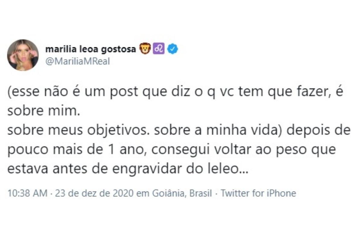 Pelo Twitter, a cantora escreveu:“(Esse não é um post que diz o que você tem que fazer, é sobre mim. Sobre meus objetivos. Sobre a minha vida) Depois de pouco mais de 1 ano, consegui voltar ao peso que estava antes de engravidar do Leleo”.