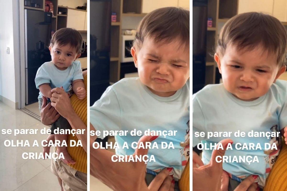 As duas amigas caem na risada com as caras e bocas do menino. “Se parar de dançar, olha a cara da criança”, escreveu Marília nas imagens do filho ficando bravo e com cara de choro ao perceber que a brincadeira parou.