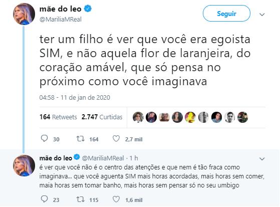 “Que você aguenta sim mais horas acordadas, mais horas sem comer, mais horas sem tomar banho, mais horas sem pensar só no seu umbigo”, completa a cantora, que recentemente mudou seu nome no Twitter para ‘mãe do leo’.
