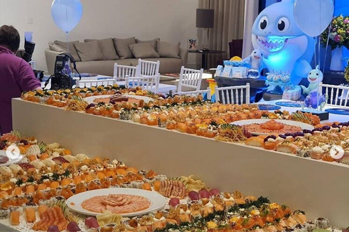 Matheus mostrou também que na festa havia um espaço para montar fantasias para as crianças, incluindo fantasia de Baby Shark. Para os adultos, além das diversas bebidas alcoólicas, Paula Aires Aleixo e seu marido prepararam um buffet de comida japonesa. Ao mostrar o buffet em seu Instagram, o cantor fez um trocadilho com o tema da festa “Baby Shark né, é isso aí!”, disse. Além do João Pedro, o casal tem mais um filho, o Davi, de 4 anos.