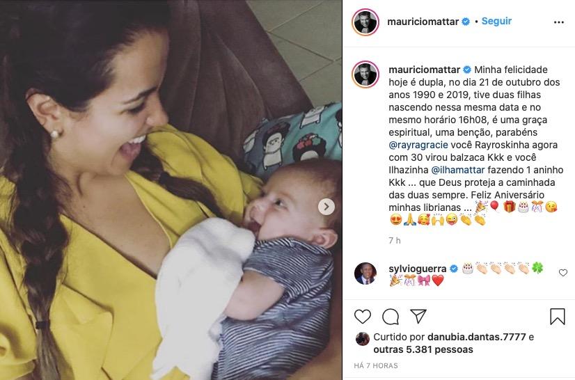 “Parabéns, @rayragracie, você Rayroskinha, agora com 30 virou balzaca. E você Ilhazinha @ilhamattar, fazendo 1 aninho… Que Deus proteja a caminhada das duas sempre. Feliz aniversário, minhas librianas”, completou Maurício, em foto das duas meninas.