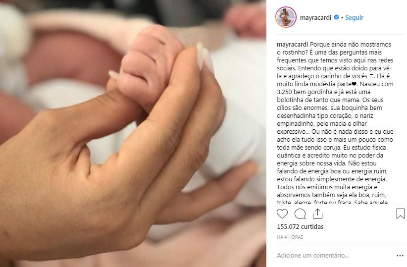 Recentemente ela decidiu explicar o motivo dessa decisão. “É uma das perguntas mais frequentes que temos visto aqui nas redes sociais. Entendo que estão doidos para vê-la e agradeço o carinho de vocês”, escreveu a influencer.