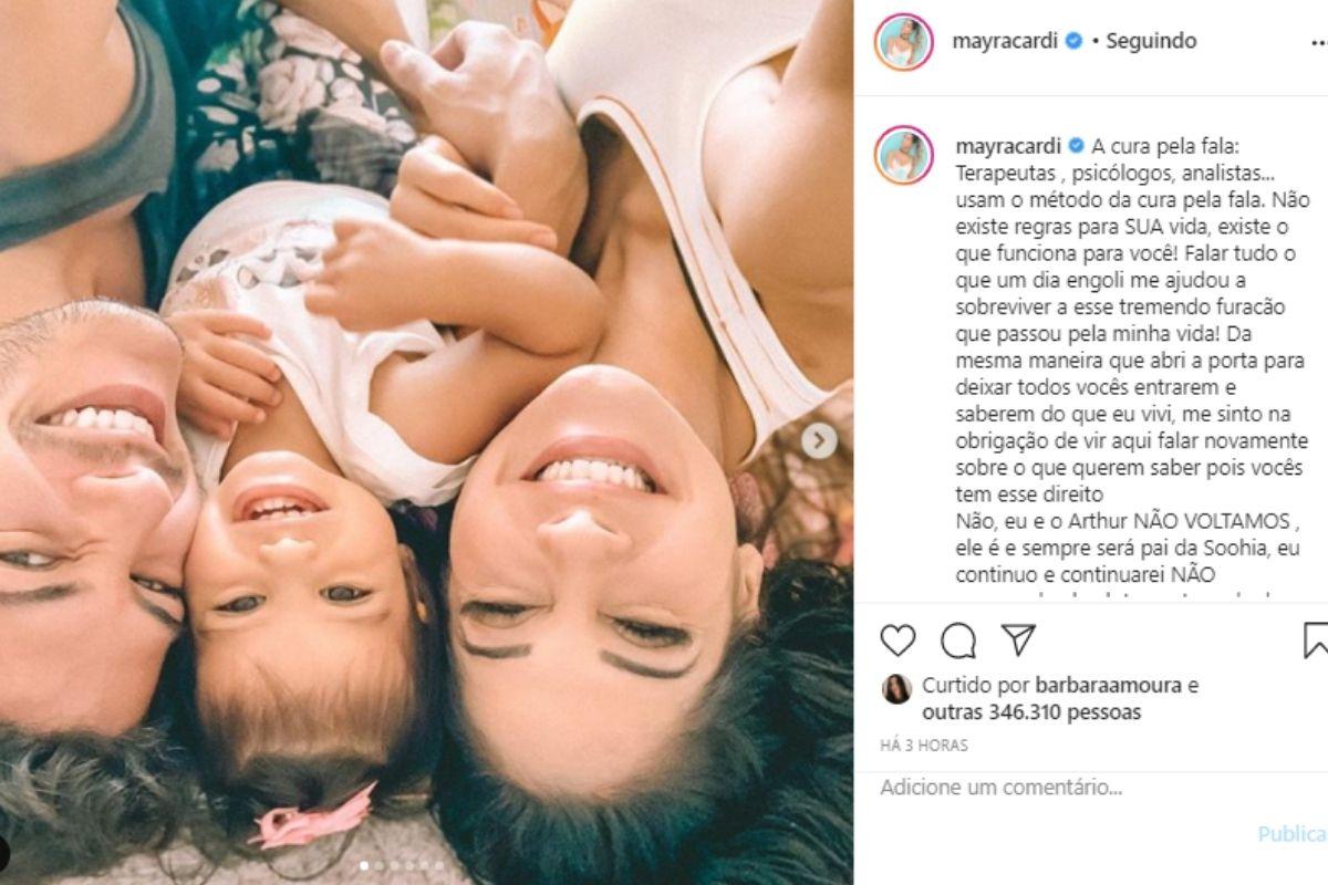 A influenciadora digital e coach Mayra Cardi surpreendeu ao usar as redes sociais para compartilhar uma sequência de fotos ao lado do ex-marido, o ator Arthur Aguiar, e da filha Sophia, de 1 ano. Ao compartilhar as imagens, a famosa fez um desabafo e contou como está a relação entre os dois. O casal teve um término conturbado, depois que a influenciadora relatou que o marido havia a traído diversas vezes, além de contar que viveu um relacionamento abusivo.