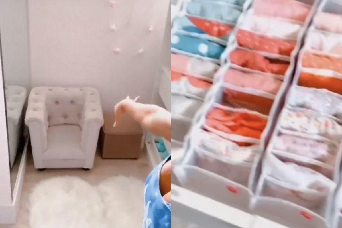 No tour que fez pelo cômodo, Mayra mostrou detalhes como as colmeias para bodies e caixas para acessórios. A famosa contou que o cômodo conta, até mesmo, com uma poltrona para ela descansar! “Tem uma poltrona pra ela descansar… Aqui tem os espelhos, sapatinhos, maiôs, bodies e caixas transparentes com laços”, falou, ao mostrar os detalhes do quarto.