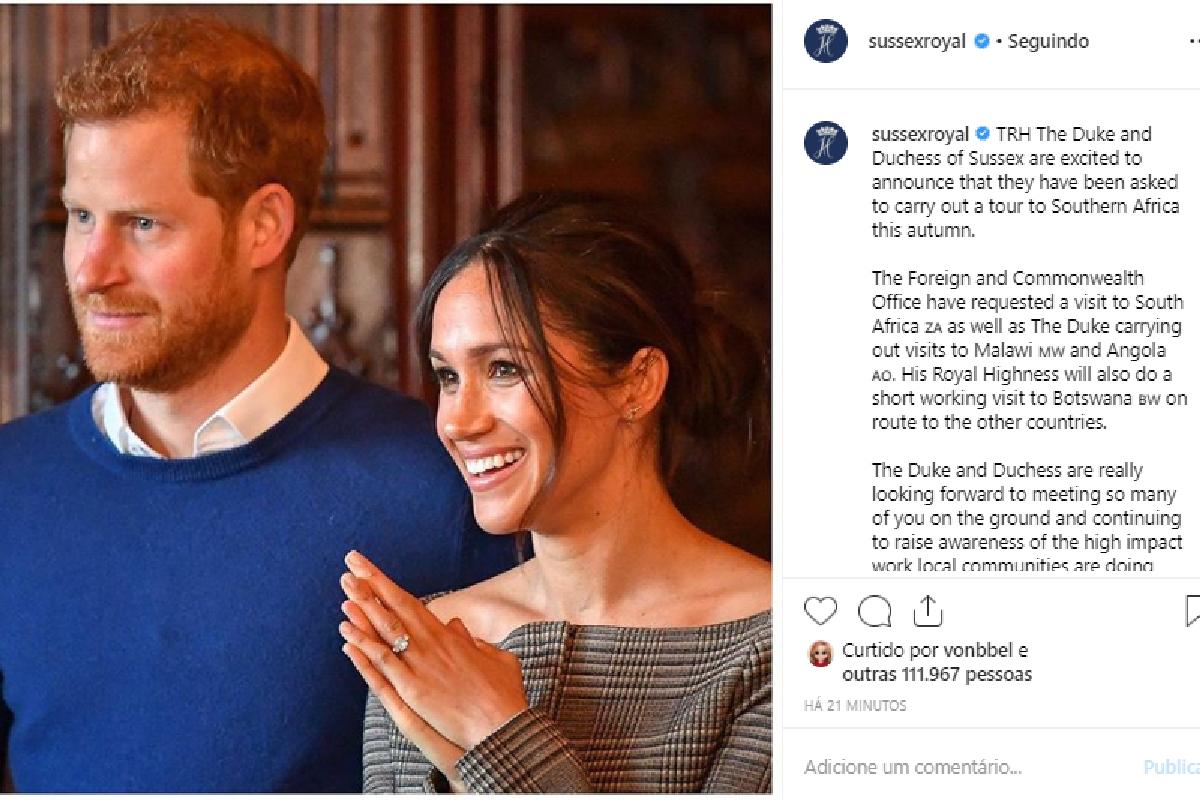 O anúncio da viagem foi feito pelo Instagram dos duques ainda no dia 27 de junho.”O Duque e a Duquesa de Sussex estão ansiosos para anunciar que eles foram convidados a fazer uma turnê pela África do Sul neste outono. O Foreign and Commonwealth Office solicitou uma visita à África do Sul, bem como ao Malawi e a Angola. Eles também farão uma curta visita de trabalho a Botsuana na rota para os outros países”.