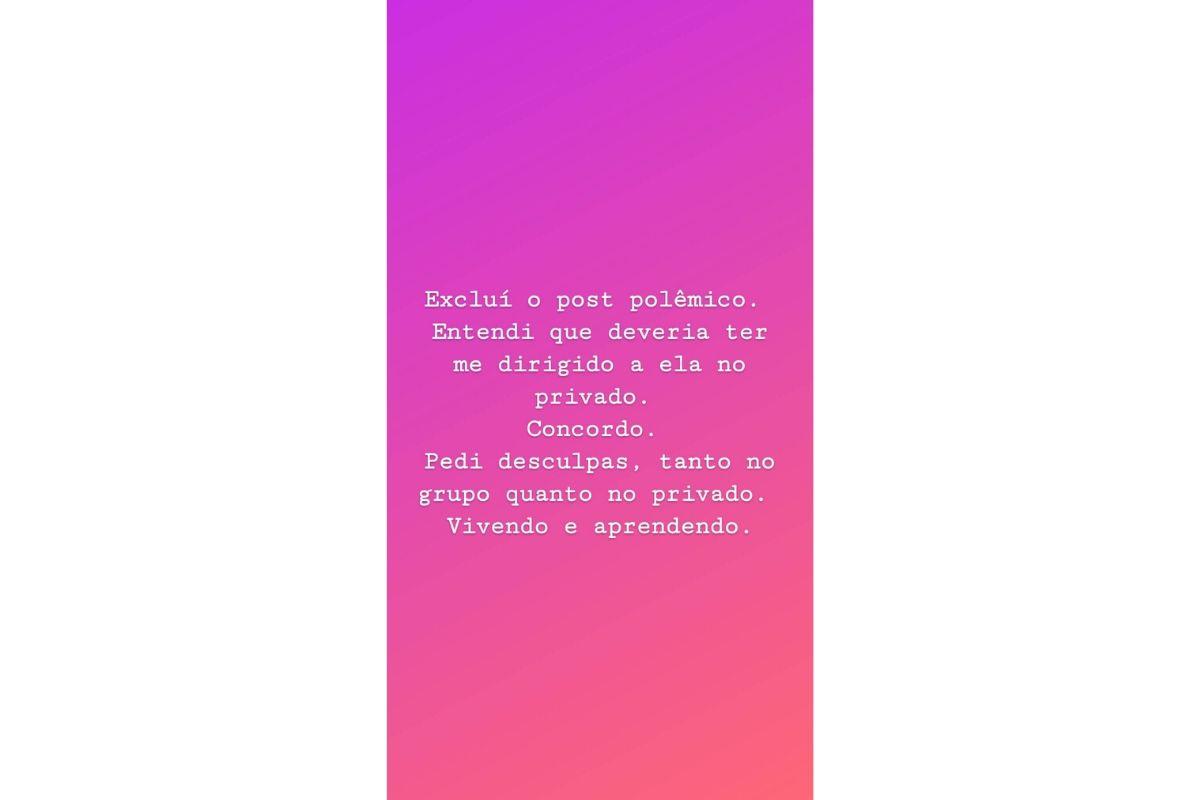 Após receber uma enxurrada de comentários negativos, Mel apagou a publicação e tomou uma atitude pelos stories, no Instagram. Em um texto, ela escreveu: “Excluí o post polêmico. Entendi que deveria ter me dirigido a ela no privado. Concordo. Pedi desculpas, tanto no grupo, quanto no privado. Vivendo e aprendendo”.