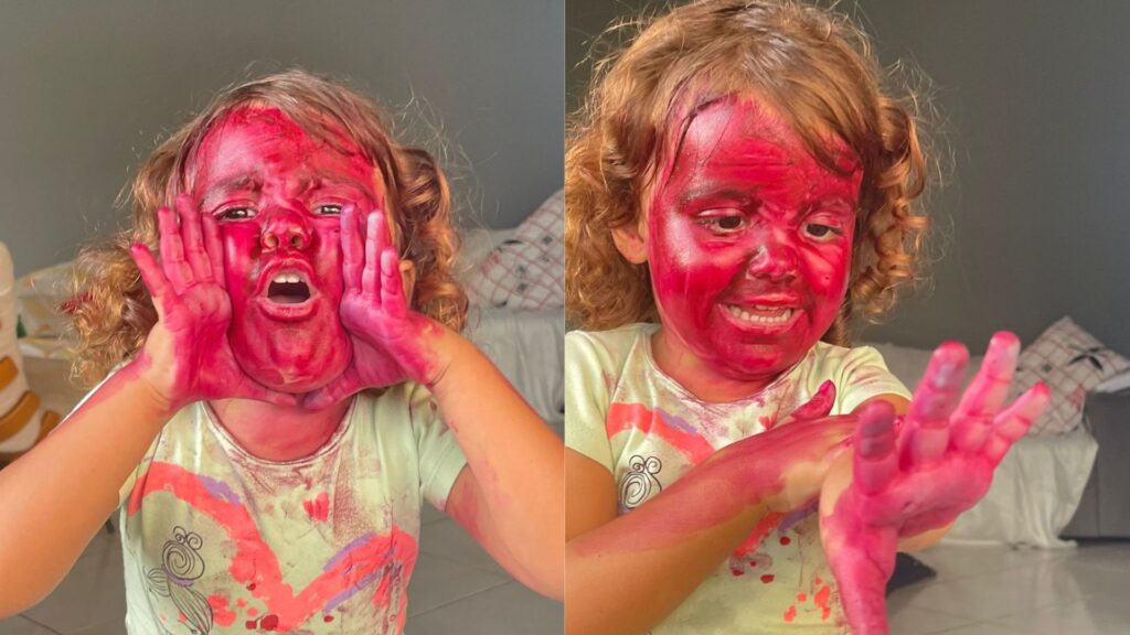 “Enquanto a gente estava desesperado, a Alice não parava de rir. Nosso filho mais velho, de 11 anos, também estava achando engraçado. A gente teve que passar o óleo até nas pernas, costas, tudo. Ela chegou até a colocar o batom na boca e eu consegui tirar. Tivemos que escovar muito os dentes dela para sair. Foram mais de 10 horas para tirar tudo”, comentou a mãe.
