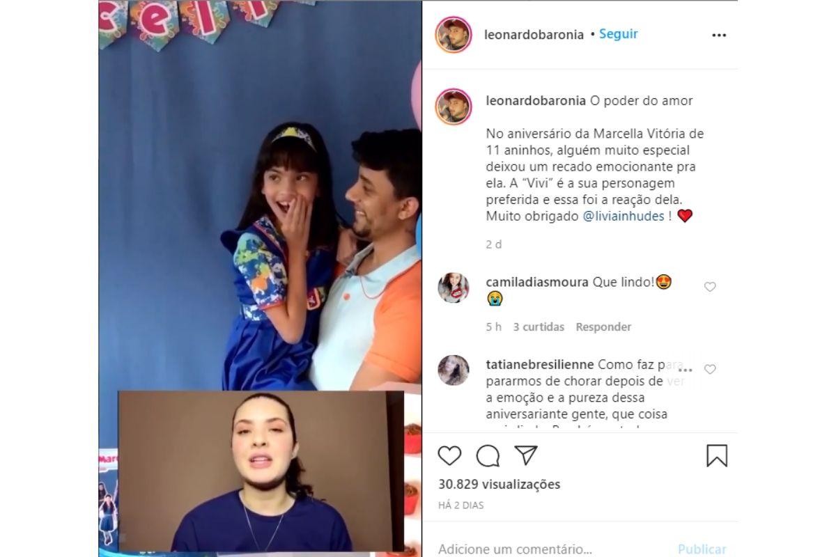 Quem teve a ideia de contactar a atriz foi o padrinho da garota, Leonardo Baronia. Fantasiada como o elenco, Marcella se emocionou muito quando viu na tela a homenagem que recebeu de Lívia e não economizou sorrisos. “O poder do amor”, escreveu o parente da menina na legenda do vídeo. A atriz de “Chiquititas” também comentou na publicação que havia ficado muito feliz com a reação de Marcella.” Meu tio/padrinho, minha tia/madrinha e minha vovó fizeram uma pequena surpresa pra mim. E eu amei gente!!!!”, falou a menina na sua conta do Instagram.