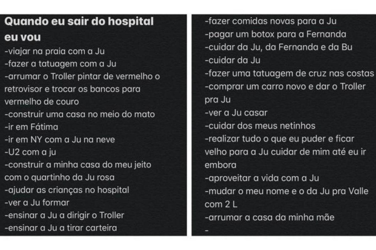 Ao entrar nas notas do celular, a garota se deparou com uma surpresa, que a fez chorar: enquanto estava no hospital, o pai fez uma lista de coisas que gostaria de fazer quando se recuperasse. “Quando sair do hospital, eu vou…”, escreveu ele, começando a lista, que tinha itens como : “ver a Ju casar“, “cuidar dos meus netinhos”, “construir uma casa no meio do mato”, “ajudar as crianças no hospital”, “fazer comidas novas para a Ju”, “fazer a tatuagem com a Ju”, entre outros. A lista continha 26 planos e uma nova linha, que ele não conseguiu completar.