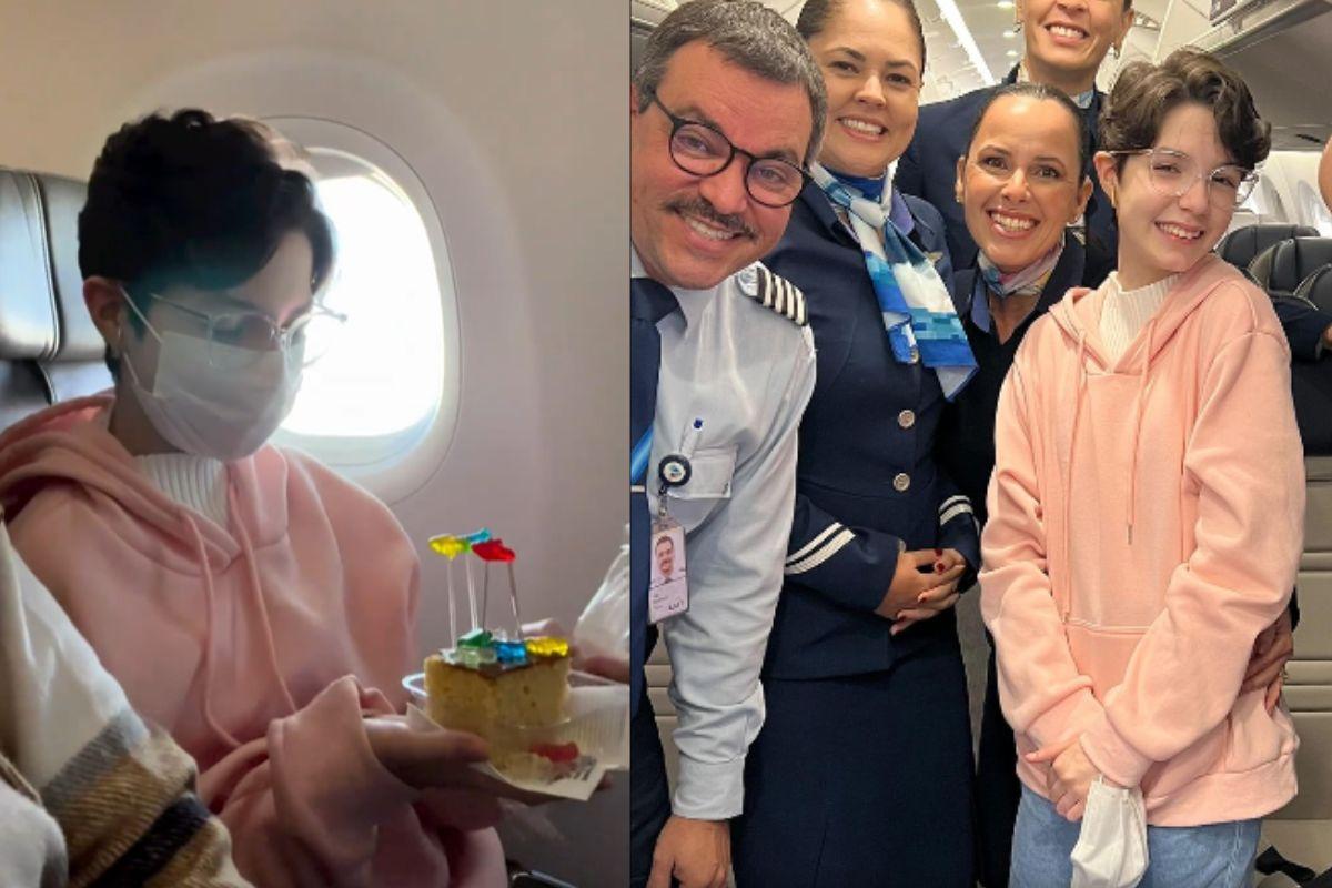 A tripulação presenteou ela com um bolo, e ao fundo passageiros batem palmas para a adolescente que estava comemorando 1 ano desde o transplante de medula. “Hoje ela completa um ano de seu renascimento, um ano de vida nova, exatamente no dia em que realiza também o seu grande sonho de voar pela primeira vez”, disse o comandante do voo.