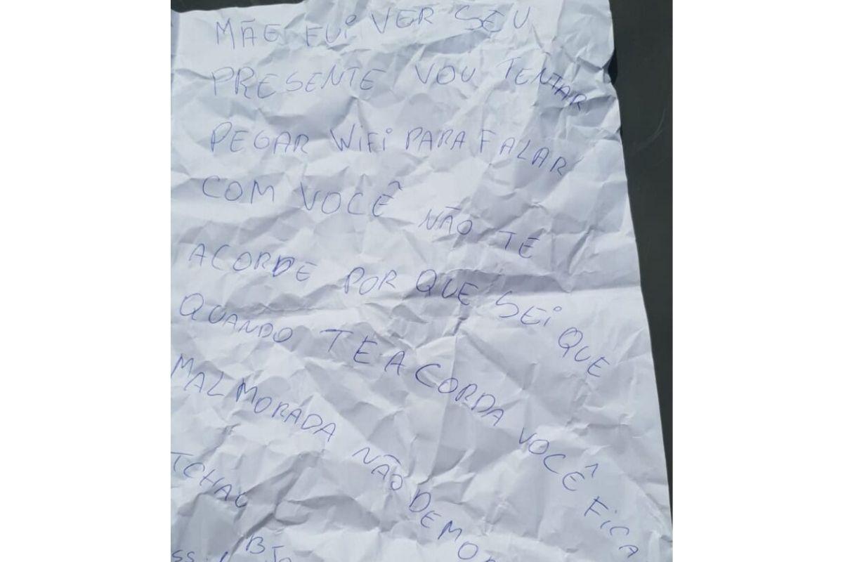 Para que a mãe não se preocupasse com a sua ausência, Alana teve a idéia de deixar um bilhete para ela, escrito com muito carinho. “Mãe, fui ver seu presente. Vou tentar pegar wi-fi para falar com você. Não te acordei porque sei que quando te acordo você fica mal humorada. Não demoro”.