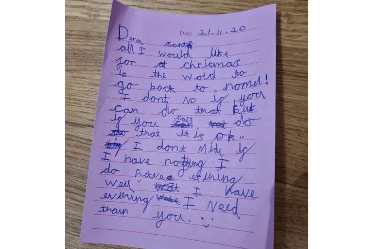 A foto da carta foi publicada em um grupo do Facebook para famílias. Kourtney começou dizendo: “Querido Papai Noel, tudo que eu gostaria no Natal é que o mundo voltasse ao normal! Não sei se você pode fazer isso, mas se você não puder, está tudo bem”.