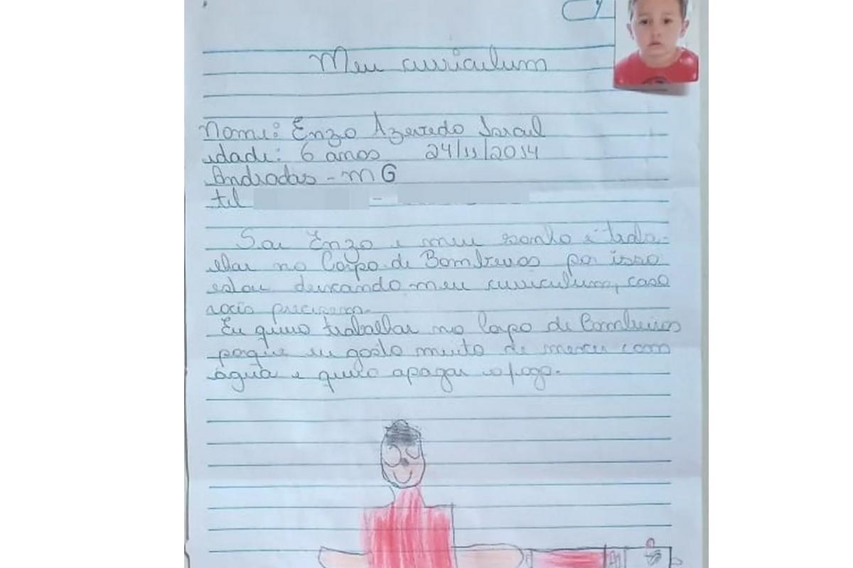 O pequeno ainda não sabe escrever e contou com a ajuda da mãe para fazer o tão desejado currículo. “Sou Enzo e meu sonho é trabalhar no Corpo de Bombeiros. Por isso, estou deixando meu curriculum, caso vocês precisem”, começou.