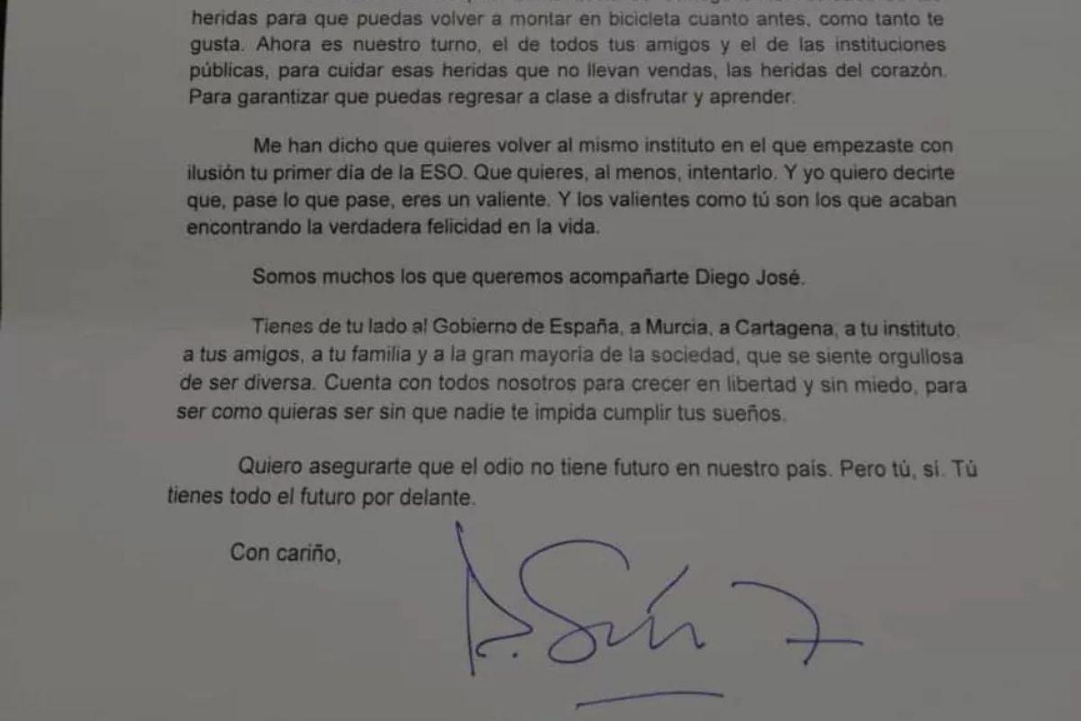 “Quero te dizer que, aconteça o que acontecer, você é um valente, e os valentes como você acabam encontrando a verdadeira felicidade na vida”, afirma na carta. O texto termina dizendo: “Quero te dizer que o ódio não tem futuro no nosso país. Mas você, sim, você tem todo o futuro adiante”.