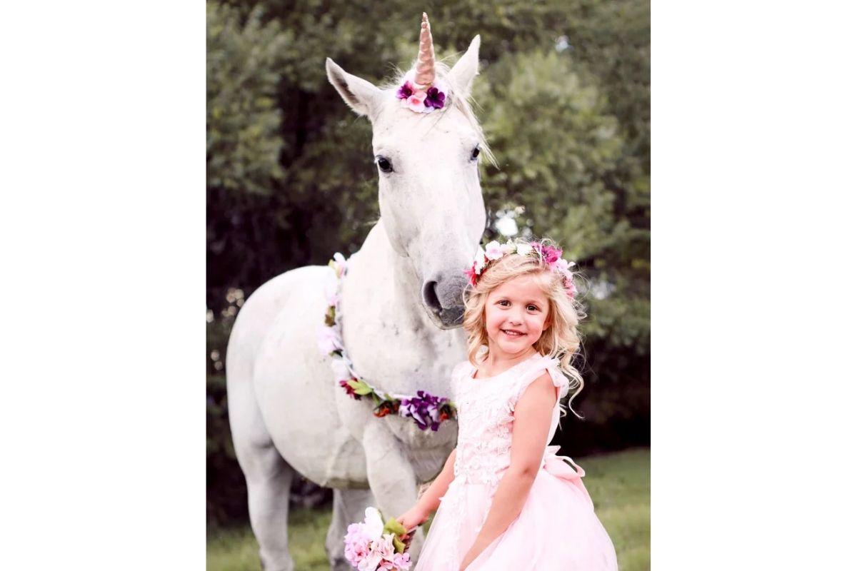 Mas a menina escolheu um tema diferente. “Emilee escolheu um tema de princesa mística para sua sessão de fotos de aniversário, que incluía um vestido rosa fofo, flores combinando e um cavalo branco com um chifre de unicórnio”.