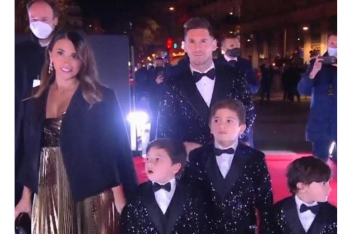 Ao chegar no prestigioso evento, Messi posou para os fotógrafos e admiradores ao lado da esposa Antonella Roccuzzo, de 33 anos de idade, e dos três filhos do casal, o primogênito Thiago, com 9 anos, Mateo, de 6, e o caçula Ciro, de 3 anos de idade.
