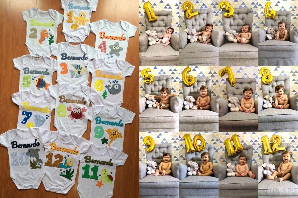 Outra dica para conseguir acompanhar essas evoluções é a marcação a partir da roupa. Você pode fazer essa técnica em casa mesmo! Garanta que seu filho sempre tenha um body branco. Em um e.v.a. desenhe o número relativo ao mês comemorado e cole no body com fitas, para que consiga retirar depois. Essa ideia também fica super legal para que você consiga identificar – sem sombra para dúvidas – de qual mês é qual foto.