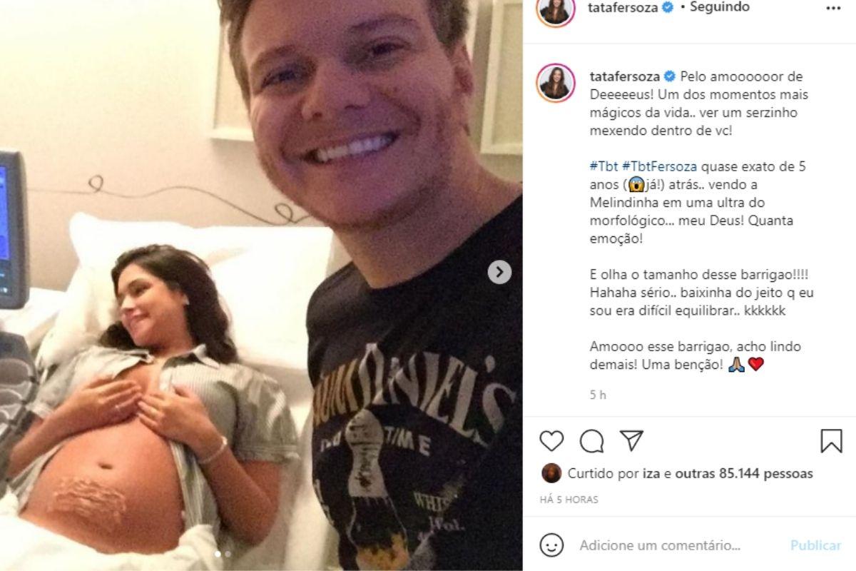 “Pelo amor de Deus! Um dos momentos mais mágicos da vida: ver um serzinho mexendo dentro de você! #Tbt #Tbt Fersoza quase exatos 5 anos (já!) atrás. Vendo a Melindinha em uma ultra do morfológico. Meu Deus! Quanta emoção! E olha o tamanho desse barrigão! Hahaha sério.. Baixinha do jeito que eu sou era difícil equilibrar.. kkkkk Amo esse barrigão, acho lindo demais! Uma bênção!”, escreveu ela ao publicar a imagem, em que os dois aparecem durante um exame de ultrassom.
